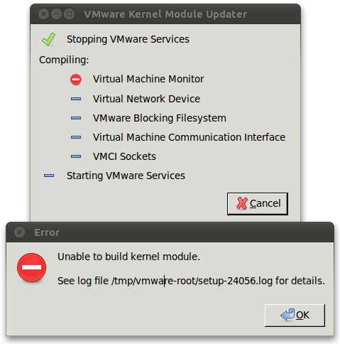 Oct 02 00:10:54.570: app-140471525164800| Your GCC version: 4.4 Oct 02 00:10:54.618: app-140471525164800| Trying to find a suitable PBM set for kernel 2.6.35-22-generic. Oct 02 00:10:54.622: app-140471525164800| Trying to find a suitable PBM set for kernel 2.6.35-22-generic. Oct 02 00:10:54.626: app-140471525164800| Trying to find a suitable PBM set for kernel 2.6.35-22-generic. Oct 02 00:10:54.628: app-140471525164800| Trying to find a suitable PBM set for kernel 2.6.35-22-generic. Oct 02 00:10:54.629: app-140471525164800| Trying to find a suitable PBM set for kernel 2.6.35-22-generic. Oct 02 00:10:54.734: app-140471525164800| Trying to find a suitable PBM set for kernel 2.6.35-22-generic. Oct 02 00:10:54.734: app-140471525164800| Building module vmmon. Oct 02 00:10:54.734: app-140471525164800| Extracting the sources of the vmmon module. Oct 02 00:10:54.744: app-140471525164800| Building module with command: /usr/bin/make -C /tmp/vmware-root/modules/vmmon-only auto-build SUPPORT_SMP=1 HEADER_DIR=/lib/modules/2.6.35-22-generic/build/include CC=/usr/bin/gcc GREP=/usr/bin/make IS_GCC_3=no VMCCVER=4.4.5 Oct 02 00:10:56.712: app-140471525164800| Failed to compile module vmmon!